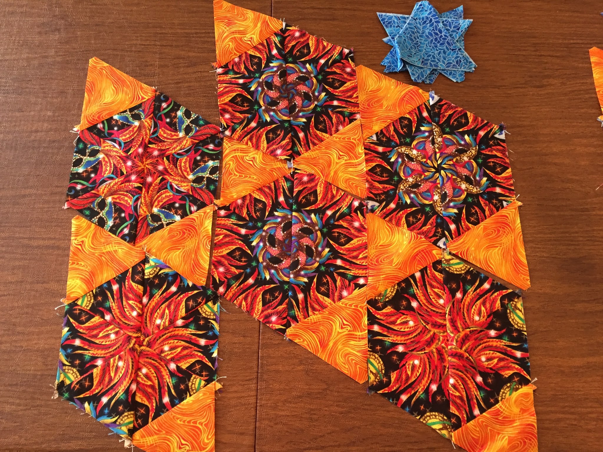 This hexagon quilt layout had gotten complicated enough for me that as well as space on my design wall (post dated 8/10/20), it had expanded to invade space on the dining room table. Now it has taken over the surface of the king size bed in the guest room. The quilt will have four columns in pink, purple, blue, and teal with bands of orange at the top and bottom. I assembly-style continued to chain piece the parallelograms formed by adding diagonal triangles to the hexagons for each of the five colors.