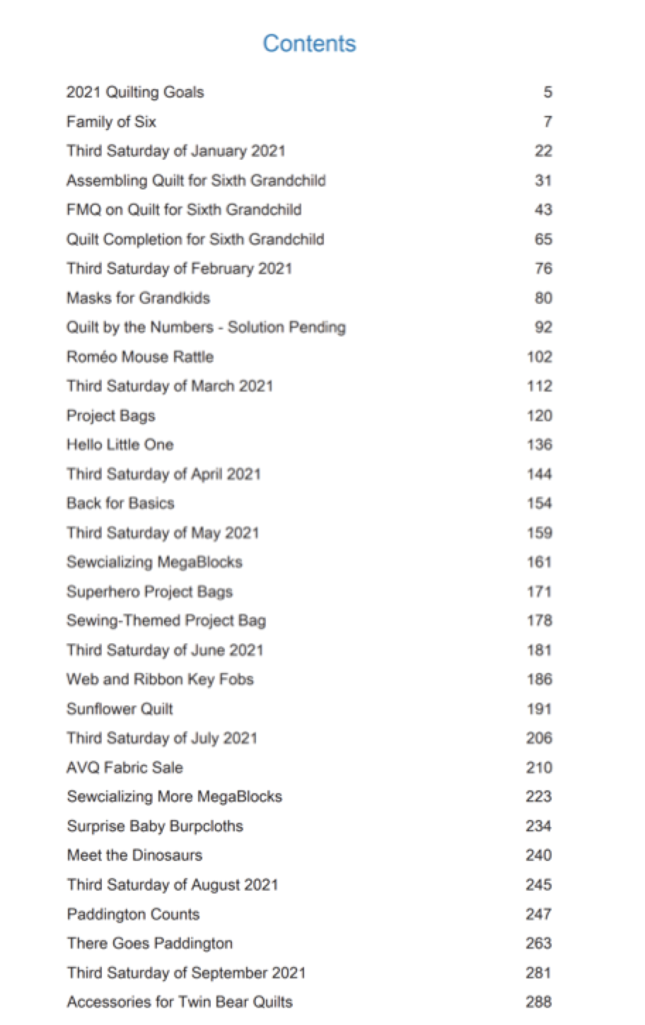 Front cover features quilt for sixth grandchild Irene, born 1/11/21 with three older siblings. Her quilt is titled It's a Party! Back cover features pair of Paddington Bear quilts for twin boys, nephews of my daughter and son-in-law in Oklahoma. Other contents include small items for grandkids and project bags.