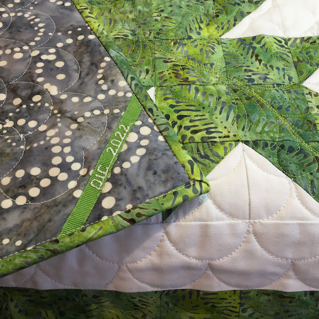 In retrospect, after completion, I reconsidered my border decisions. The edges are wavy although I thought I'd been careful not to stretch them during binding application. Perhaps making the batik border as a pieced set of squares, instead of a continuous cut of fabric, contributed to a larger length due to seam allowance build-up. But I do I think it lay flat before quilting. An equally likely a culprit is that there was a lot of FMQ in the central section and not along the edges. It will be tricky to stitch it now that the binding is on, but I decided to try quilting some diagonal parallel lines between the outermost row of clamshells and the binding along the border to see if that would help helped draw the edges in a bit. I learned that my Slim ruler designed by Angela Walters does have handy 45° guidelines that helped me keep the tilt angle correct on my stitched piano key borders.  I initially thought the binding might fight my efforts but I was able to work around it.